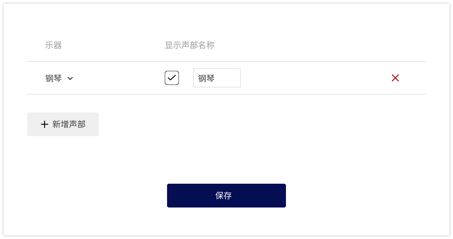 在声部设置中,可以对声部进行排序,选择声部音色,也可重命名声部,设置是否在谱面显示声部名称等操作。
